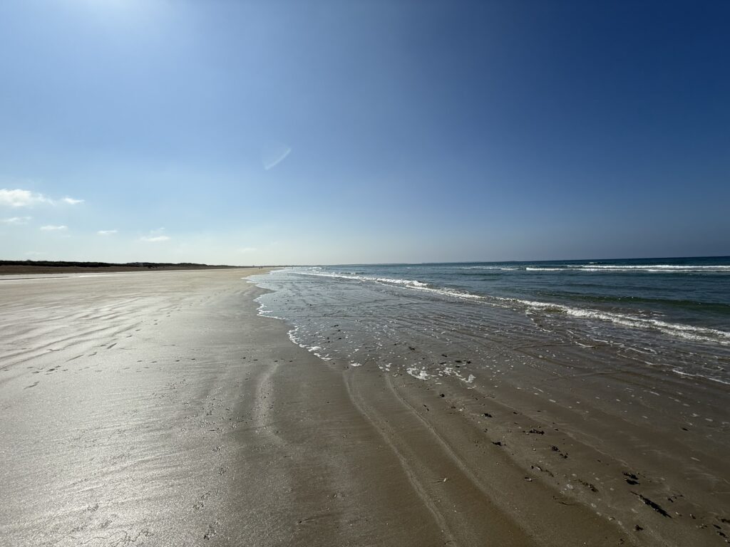 Um 12:30 war ich bereits am Ziel, aber die Rezeption war erst wieder um 16:00 Uhr besetzt. Also machte ich es mir am Strand gemütlich. Davon gibt’s ja genug hier. Zum Baden war das Meer allerdings zu stürmisch.