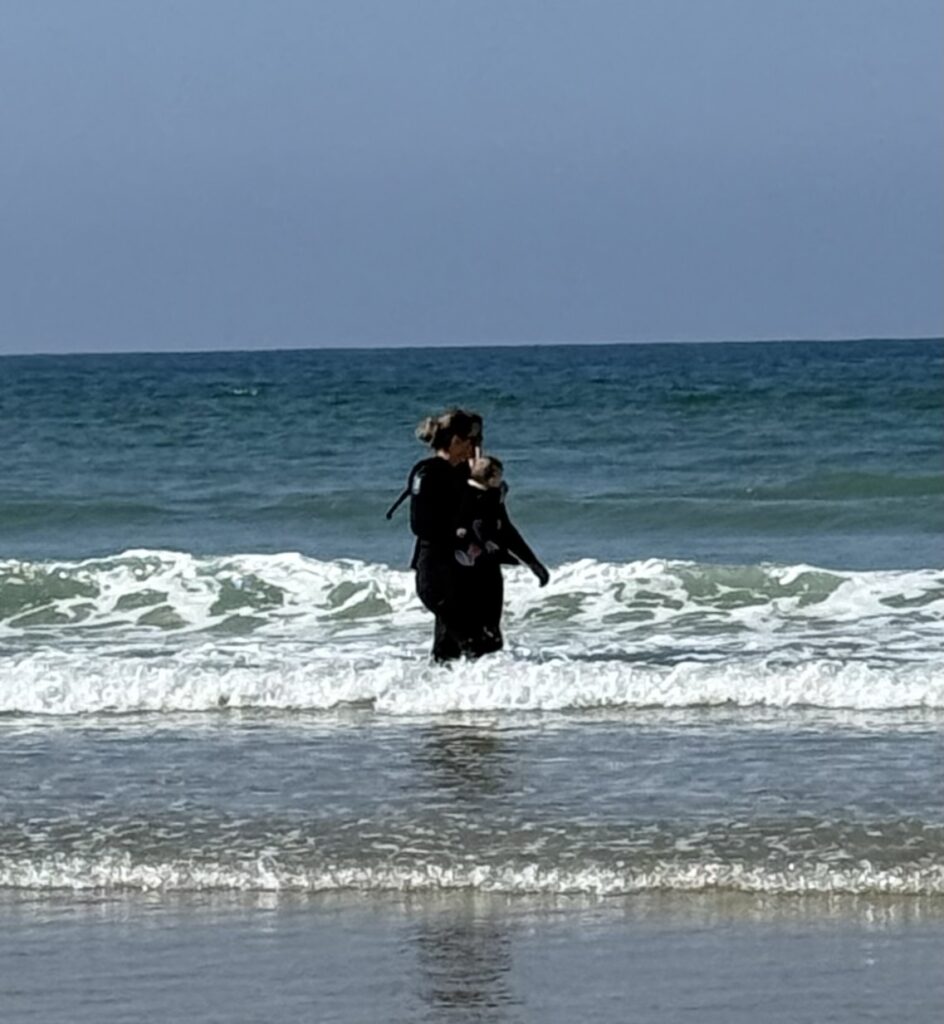 Hier gehen Mütter mit ihren Babies im Meer spazieren.