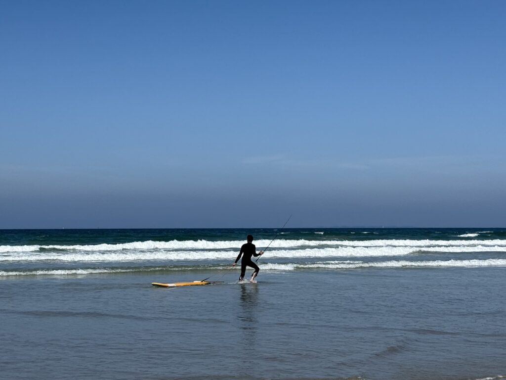 Und er kann sich wohl nicht entscheiden, ob er fischen oder surfen soll. Beides zusammen scheint mir eher schwierig.