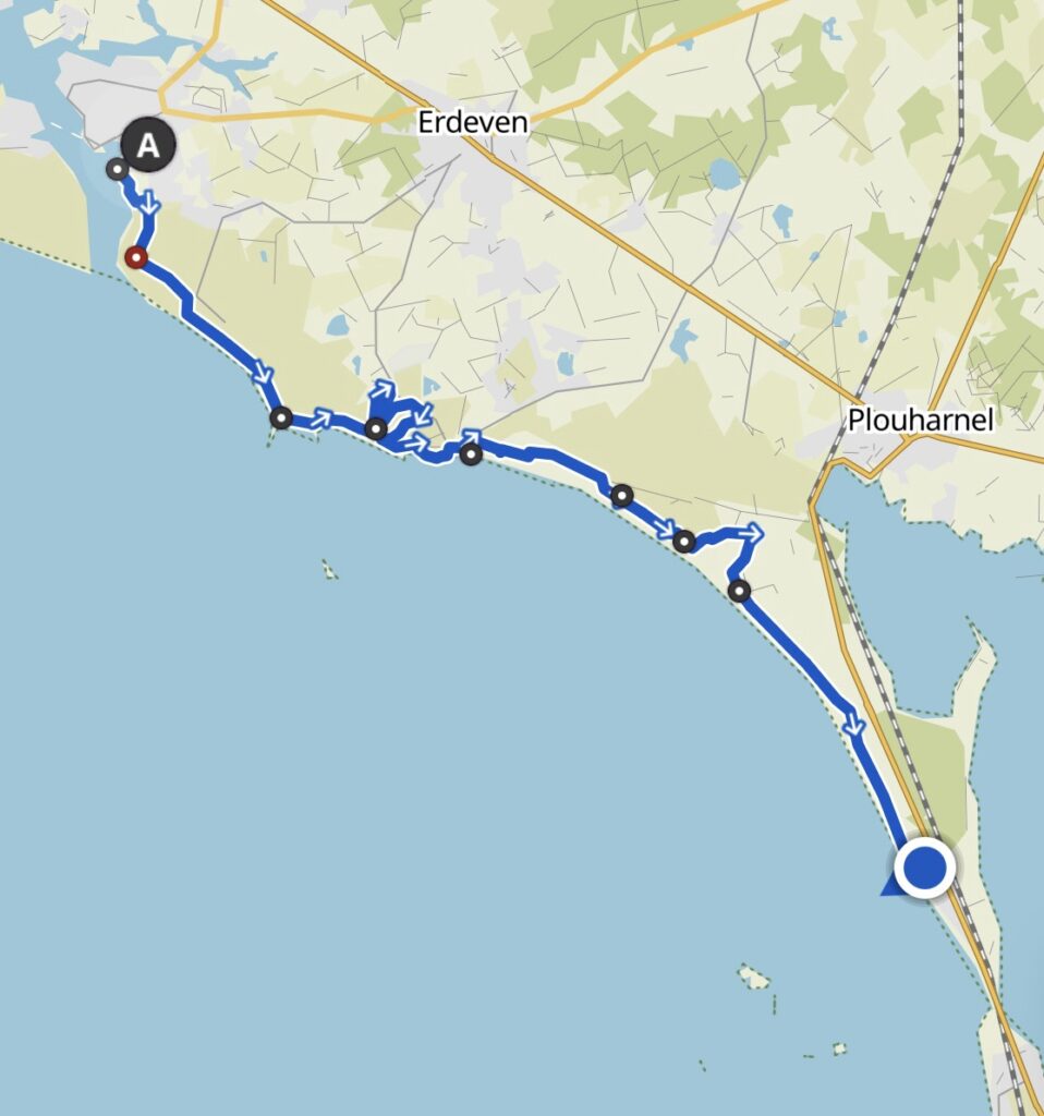 Die GR34 Route hätte heute eigentlich über Erdeven geführt, also nicht entlang der Küste. Wieso das so ist, kann ich mir nicht erklären, denn es führt auch ein offizieller Wanderweg und teilweise auch die Veloroute entlang der Küste. Also war ich heute etwas auf Abwegen.