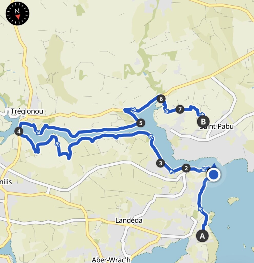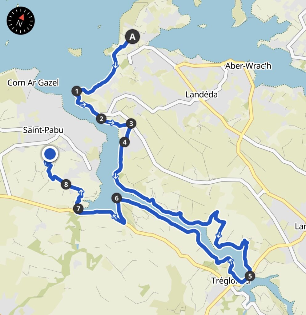 Nach etwa 3 km befand ich mich am Eingang zum Aber Benoit und konnte auf der gegenüberliegenden Seite bereits mein Ziel St. Pabu sehen. Luftlinie etwa 500 Meter zum Wandern aber noch fast 20 km. Das ist jeweils schon etwas frustrierend. 🙄