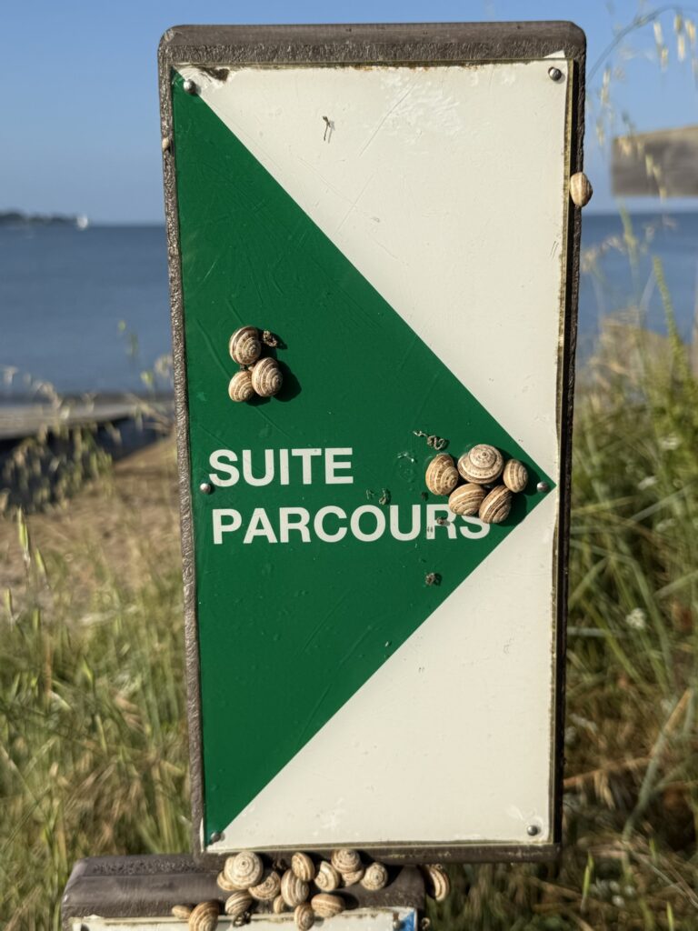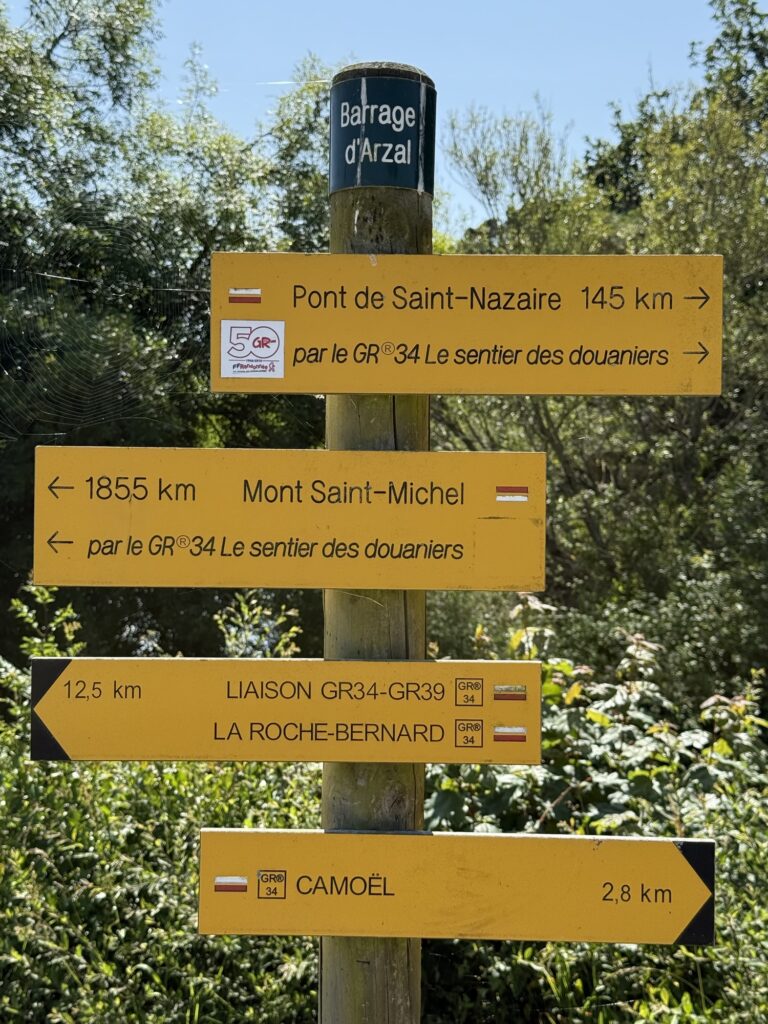 Gleich nach der Brücke stand dieser Wegweiser! Ja Saint-Nazaire rückt näher. Am 30. April 2023 beim Mont Saint-Michel begann meine Wanderung auf dem GR34 und nun bin ich schon bald am Ziel.