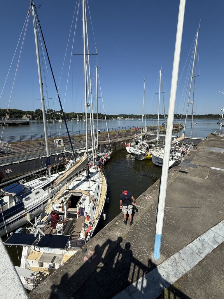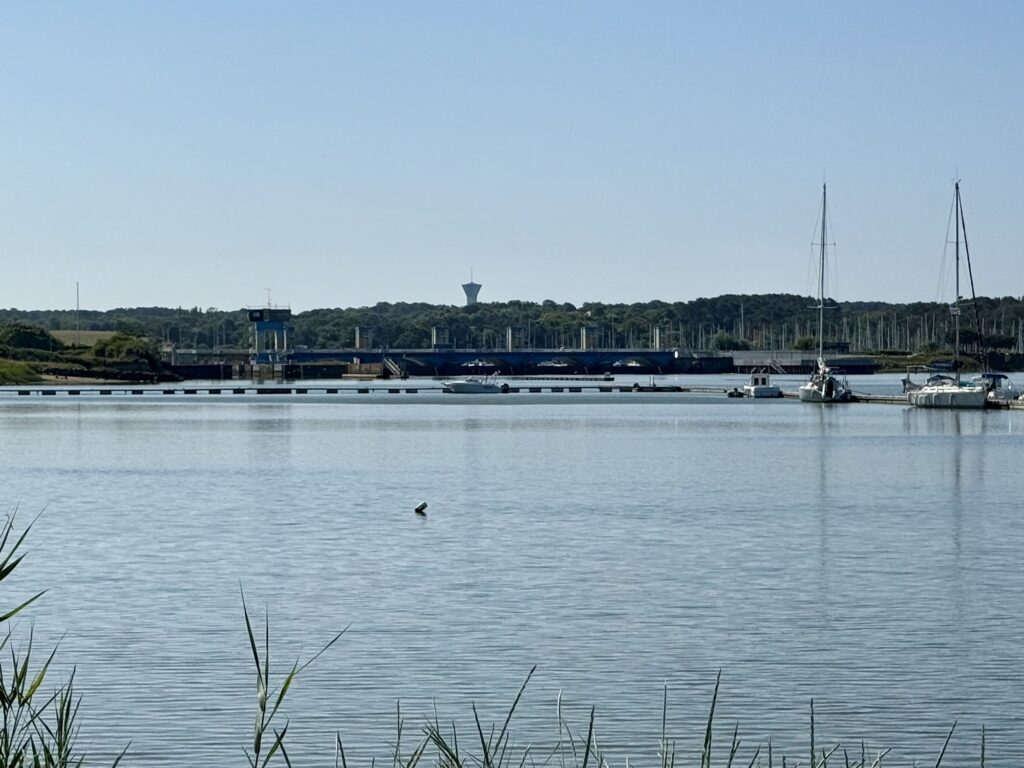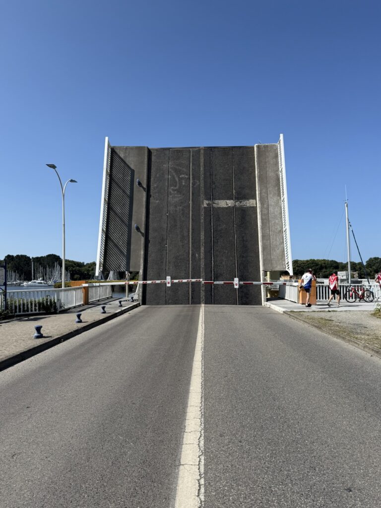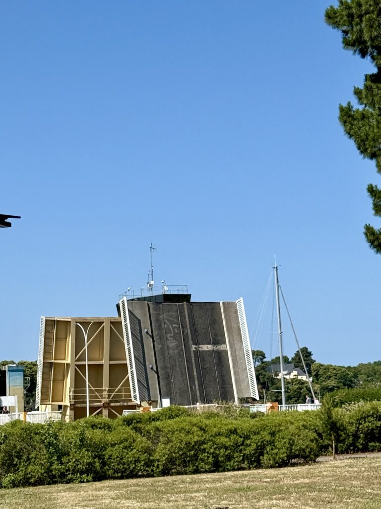 Von weitem sah man schon das Sperrwerk (Barrage) von Arzal, das sich an der Mündung des Flusses Vilaine befindet. Es dient zur Regulierung des Wasserstands und zur Vermeidung von Überschwemmungen sowie als Straßenübergang über die Vilaine. Bevor ich das Sperrwerk überquerte, machte ich noch kurz eine Kaffeepause. Plötzlich hörte man ein Warnsignal, das nicht aufhören wollte. Ich schaute wohl etwas verwundert aus, da meinte der Herr am Nebentisch es höre bald auf. Gut zu wissen, aber von wo es kommt, weiss ich trotzdem nicht. Da sah ich aber, dass die Brücke hochgezogen wurde und ein Segelschiffe nach dem anderen in die Schleuse fuhr.