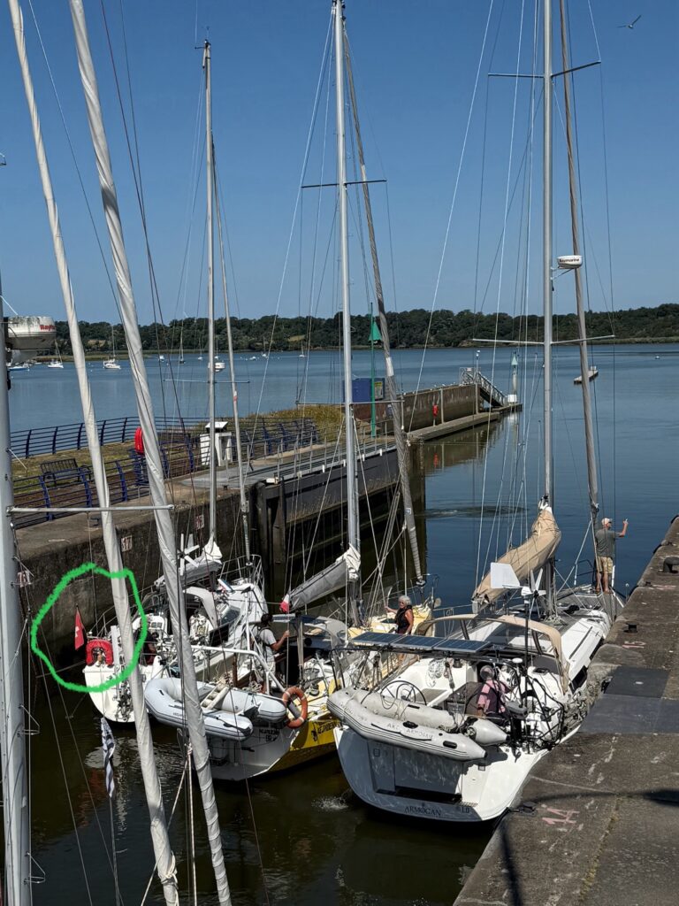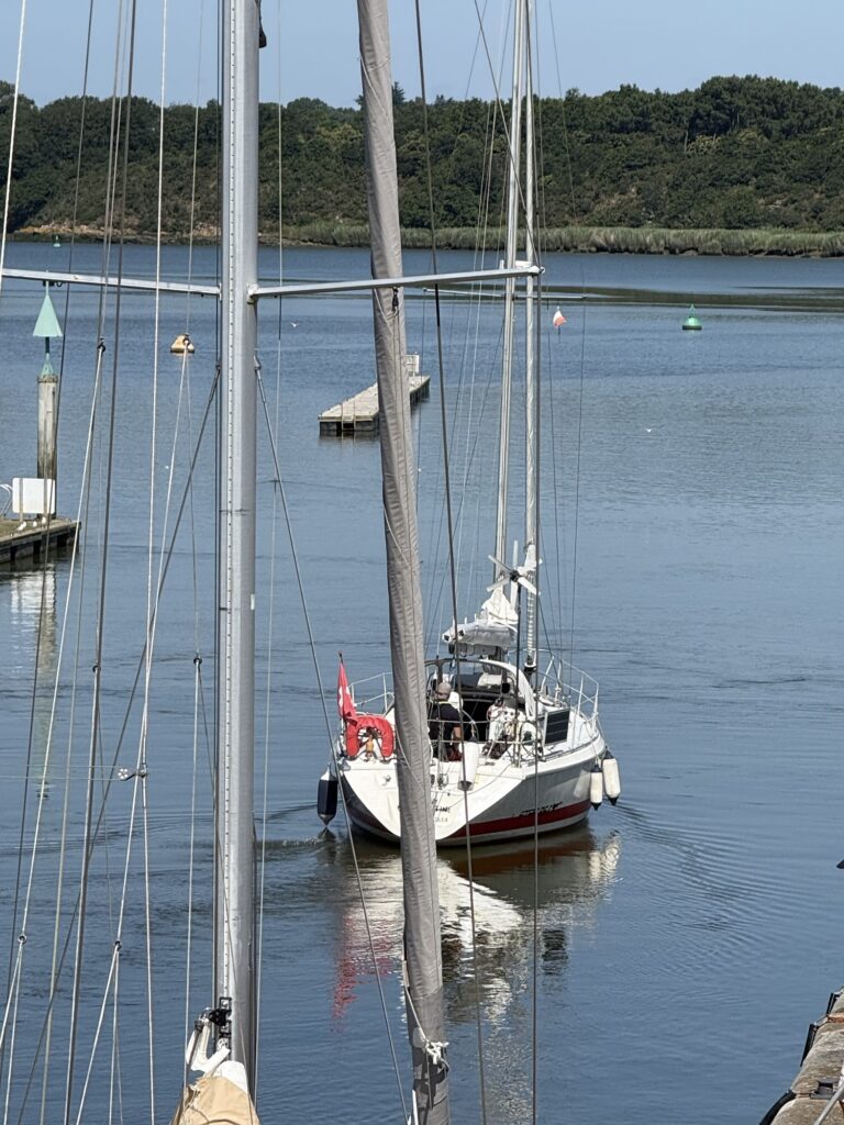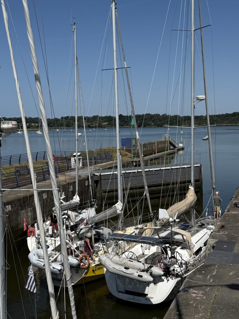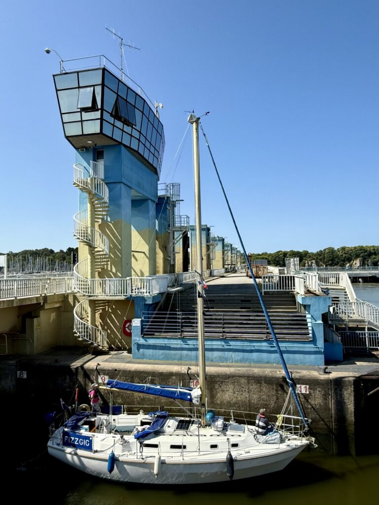 Von weitem sah man schon das Sperrwerk (Barrage) von Arzal, das sich an der Mündung des Flusses Vilaine befindet. Es dient zur Regulierung des Wasserstands und zur Vermeidung von Überschwemmungen sowie als Straßenübergang über die Vilaine. Bevor ich das Sperrwerk überquerte, machte ich noch kurz eine Kaffeepause. Plötzlich hörte man ein Warnsignal, das nicht aufhören wollte. Ich schaute wohl etwas verwundert aus, da meinte der Herr am Nebentisch es höre bald auf. Gut zu wissen, aber von wo es kommt, weiss ich trotzdem nicht. Da sah ich aber, dass die Brücke hochgezogen wurde und ein Segelschiffe nach dem anderen in die Schleuse fuhr.