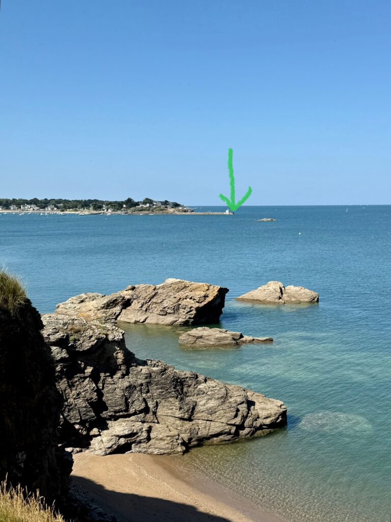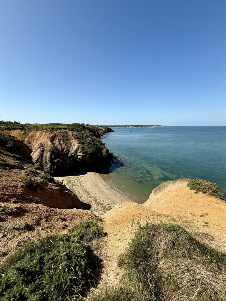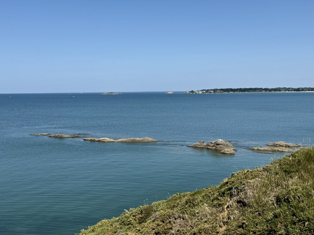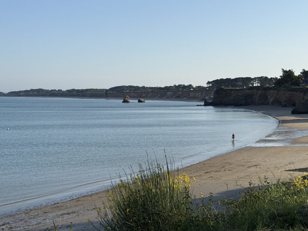 Ein Blick zurück zu den Klippen von Pénestin – im Morgenlicht sehen die Klippen La Mine d‘Or ganz unspektakulär aus.