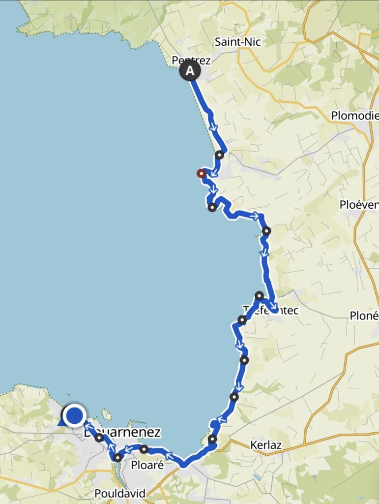 Die letzte Nacht verbrachte ich wieder in einem Chambres d’hotes bei Madame Renée. Ich fragte sie, ob es möglich sei, dass man von hier schon die Spitze des Phare Eckmühl sehen könne. Schliesslich haben es Leuchttürme ja so an sich, dass man sie schon von weitem sieht. Sie meinte jedoch, den sähe man nicht von Pentrez. Aber irgend einen Turm habe ich gesehen. Vielleicht finde ich das ja noch heraus, was für einer es ist.