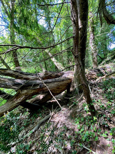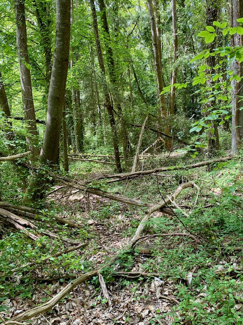 Eigentlich wäre die heutige Route relativ kurz und einfach gewesen. Der grösste Teil führte mich über asphaltierten Nebenstrassen. Doch irgendwo muss ich eine Abzweigung verpasst haben und so orientierte ich mich nach meinem Komoot App. Da landete ich erst mal in einem sumpfigen Bachbett. Also beschloss ich etwas oberhalb weiter zu gehen, die Richtung stimmte ja. Von einem Weg war schon lange nichts mehr zu sehen. Es war nur noch dichtes Gestrüpp und Bäume die kreuz und quer langen. Teilweise musste ich den Rucksack zuerst untendurch schieben, weil sonst an ein Durchkommen nicht zu denken gewesen wäre. Mein Hauptgedanke: einfach kein Bein brechen sonst vermoderst du hier wie die Bäume. Ich muss wohl nicht erwähnen, dass ich auf diesem Teil niemandem begegnet bin. Nachdem ich mich noch durch Brombeergestrüp gekämpft habe, landete ich wieder auf einer Strasse. Bald schon tauchte auch wieder das erste Wanderwegzeichen auf. Ich konnte also nicht allzu weit vom Weg abgekommen sein. Fazit des heutigen Tages: Auch bei vermeintlich einfachen Strecken kann es abenteuerlich werden.