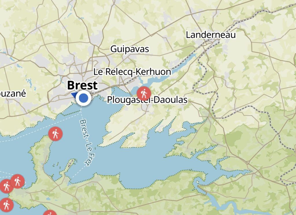 Von hier wären es nochmals 15 km nach Brest gewesen, wobei einige Kilometer durch Stadtgebiet geführt hätten, was eher mühsam ist zum laufen. Nach 8 km führte der Weg jedoch am Technopôle Brest Iroise vorbei und von dort fährt ein Bus direkt zum Hafen von Brest, wo ich mein Hotel habe. Und der Bus fährt auch noch regelmässig d.h. ich musste nur ein paar Minuten warten. Also für einmal eine unkomplizierte Sache. So wurden aus den geplanten 25 km nur 18 km.