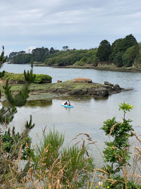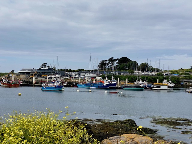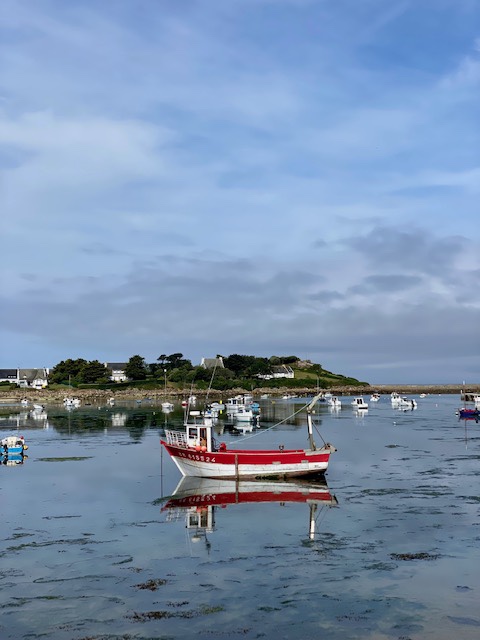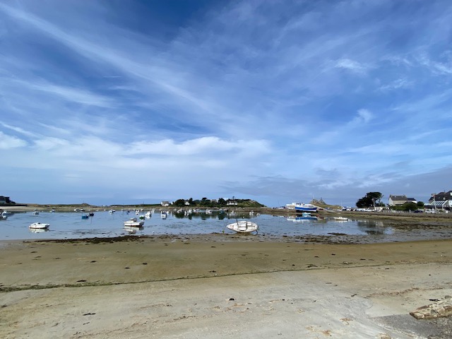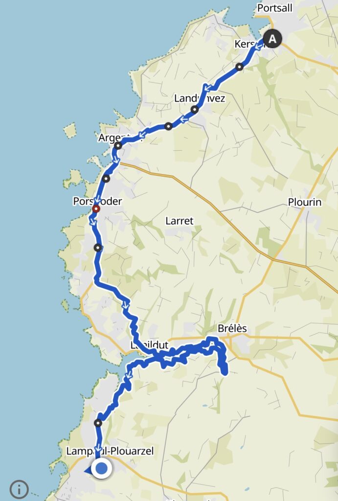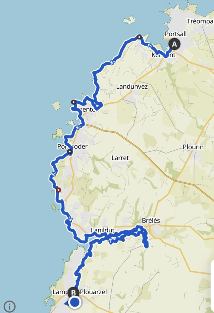 Meine gestrige Etappe hätte eigentlich in Porspoder enden sollen, aber da dort keine Unterkunft zu finden war, übernachtete ich in Portsall. Das hätte aber bedeutet, dass die heutige Etappe 34 km gewesen wäre. Das war mir eindeutig zu viel. Zumal es auch heute sehr schwül und heiss war. An einem Sonntag in einem kleinen Dorf in der Bretagne ein Taxi zu bekommen, ist ein Ding der Unmöglichkeit. Die arbeiten Sonntags nicht. Ich hab‘s dann mal mit Uber versucht. Das sah ganz vielversprechend aus. Es hiess dann es werden mir gleich die Kontaktdaten des Fahrers mitgeteilt. Ist ja super wie das funktioniert, dachte ich noch. Nach etwa 5 Minuten hiess es dann: sorry wir konnten leider keinen Fahrer für sie finden. Hätte ich mir ja denken können, hier ticken die Uhren noch anders. Ich fragte die Madame von der Unterkunft nochmals, ob sie niemanden privat kenne, der mich gegen Bezahlung ein Stück weit fahren würde. Aber auch das klappte nicht. Also musste schnell mal einen Plan B her. Ich habe dann beschlossen nicht auf dem GR34 sondern auf direktem Weg nach Porspoder zu laufen. Dort wusste ich , dass es ein grösseres Hotel hat und ich vielleicht von dort ein Taxi auftreiben kann. Zwischendurch versuchte ich es immer mal wieder mit Autostop, aber mich alte Schachtel nahm niemand mit. Im Hotel konnte sie mir dann tatsächlich ein Taxi organisieren, es sei in einer halben Stunde da, es dauerte dann zwei Stunden. 🙈😵💫