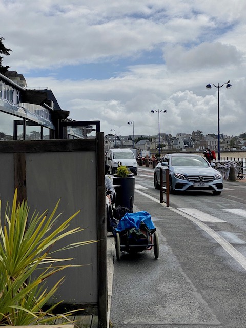 In Erquy angekommen hielt ich Ausschau nach einem Restaurant und was sehe ich als erstes! DAS BLAUE WÄGELI!!! Ich fass es nicht da sitzt der Monsieur rauchend und Bier trinkend mit den beiden Frauen, die ich heute morgen beim Zmorgen essen getroffen habe! Unglaublich!!! Ich habe mich dann auch in diesem Restaurant niedergelassen (natürlich auch etwas aus Neugier) und nach wenigen Minuten tauchte auch noch die Frau mit den nassen Füssen auf (wobei ich nehme an sie sind jetzt trocken). Es kam mir schon fast wie ein Familientreffen vor. Wenig später verabschiedeten sich die beiden Frauen vom Wägeli-Ma und kurz darauf machte auch er sich wieder auf den Weg. Da ich bis Pléneuf-Val-André noch ca. 10 km vor mir hatte, ging auch ich weiter. Etwas weiter vorne sah ich gerade noch wie Monsieur Voiture links ins Dorf abbog. Entweder er hat sein Ziel für heute erreicht oder er nimmt die Strasse.